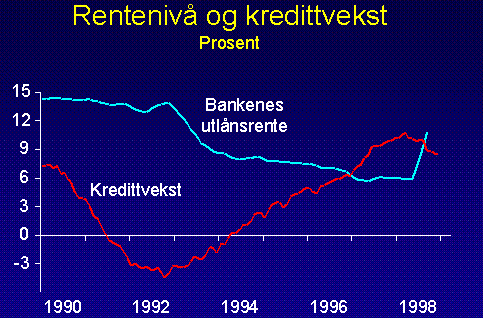 Figuren viser tolvmånedersveksten i innenlandsk kreditt (K2), og en veid gjennomsnittlig rente for private bankers utlån av kroner til publikum.