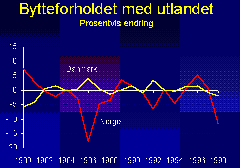 Bytteforholdet måler hvor mye vi får igjen av importvarer for en enhet av våre eksportvarer. Når bytteforholdet med utlandet faller, må vi eksportere mer enn før for å kjøpe den samme mengden importvarer. Den kraftige svekkelsen i vårt bytteforhold i 1986 og 1998 reflekterer fall i oljeprisen.