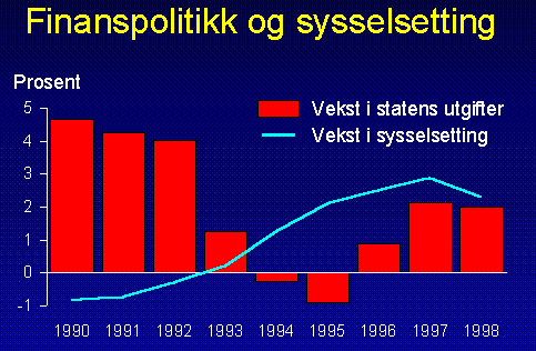 Figuren viser vekstrater for samlet sysselsetting og Statsbudsjettets reelle, underliggende utgiftsvekst, korrigert blant annet for utgifter til oljevirksomhet, dagpenger og renter.