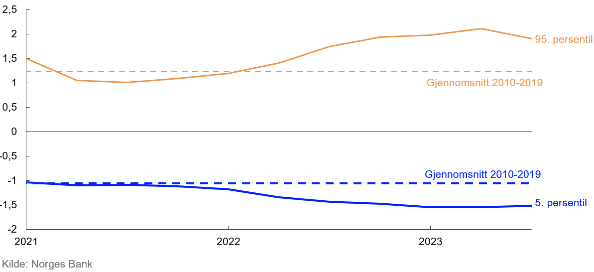 Før pandemien brukte vi sannsynlighetsvifter rundt anslagene våre. Slike vifter kan illustrere usikkerheten rundt anslag basert på historiske prognosefeil. Da pandemien traff oss, ble det åpenbart at disse viftene ikke ga et godt uttrykk for usikkerheten fremover. Det illustrerer en utfordring med sannsynlighetsvifter: De kan gi inntrykk av at vi klarer å tallfeste usikkerhet som i realiteten ikke kan måles. Særlig kan symmetriske vifter, som vi brukte tidligere, være misvisende. Den typen asymmetriske vifter som komiteen foreslår, er bedre. I våre siste pengepolitiske rapporter har vi illustrert usikkerhet rundt noen sentrale anslag. Vi anvender en metode som også åpner for at usikkerheten kan være asymmetrisk og variere over tid. Dette er nyttig. Samtidig vil heller ikke disse beregningene ta høyde for alle mulige utfall.