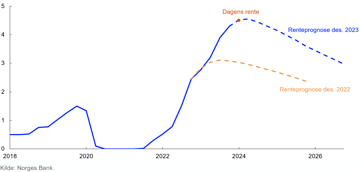 Figur: Prognosen for styringsrenten ble oppjustert gjennom 2023