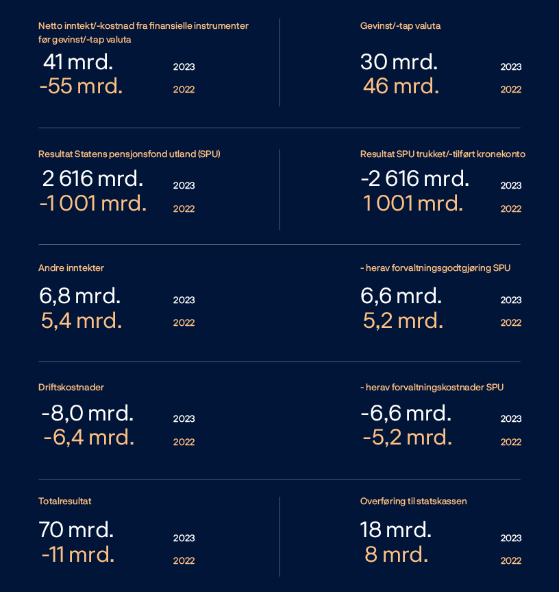 Markedsverdien til den samlede aksje- og renteporteføljen var 654,4 milliarder kroner ved utgangen av 2023. Det er 72,0 milliarder kroner mer enn i 2022. Ved utgangen av året var verdien av aksjeporteføljen 143,1 milliarder kroner, mens verdien av renteporteføljen var 511,3 milliarder kroner.
