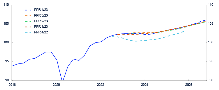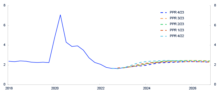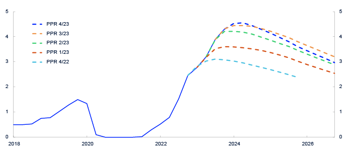 Året 2023 var preget av fortsatt høy inflasjon og stigende styringsrenter internasjonalt. Kronekursen svekket seg videre i 2023, særlig frem mot sommeren. Det var høy prisvekst både på varer som importeres til Norge, og på norskproduserte varer og tjenester. For å dempe prisveksten hevet komiteen for pengepolitikk og finansiell stabilitet den norske styringsrenten fra 2,75 til 4,5 prosent i løpet av året. Les mer om dette i Komiteens beretning.