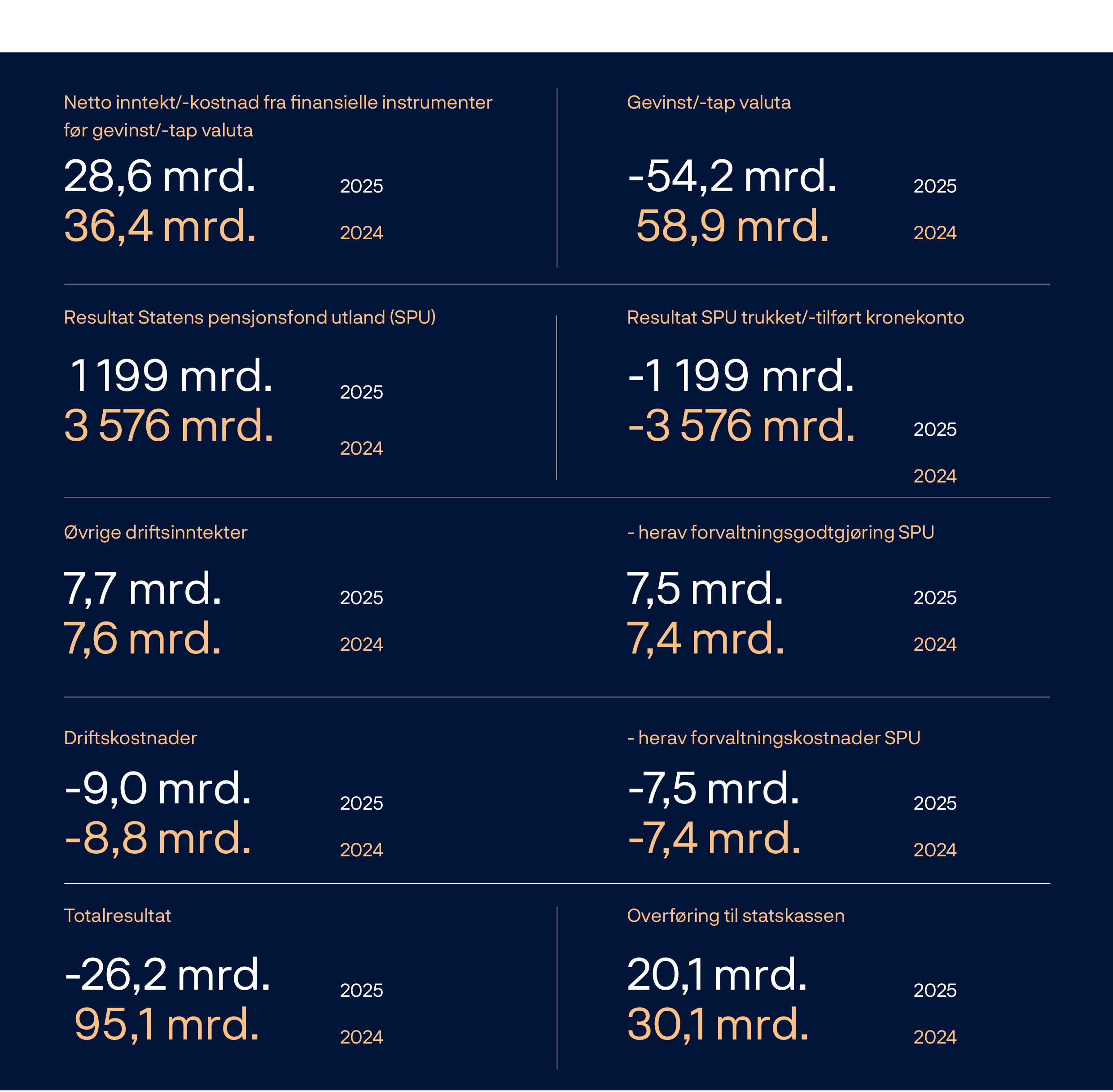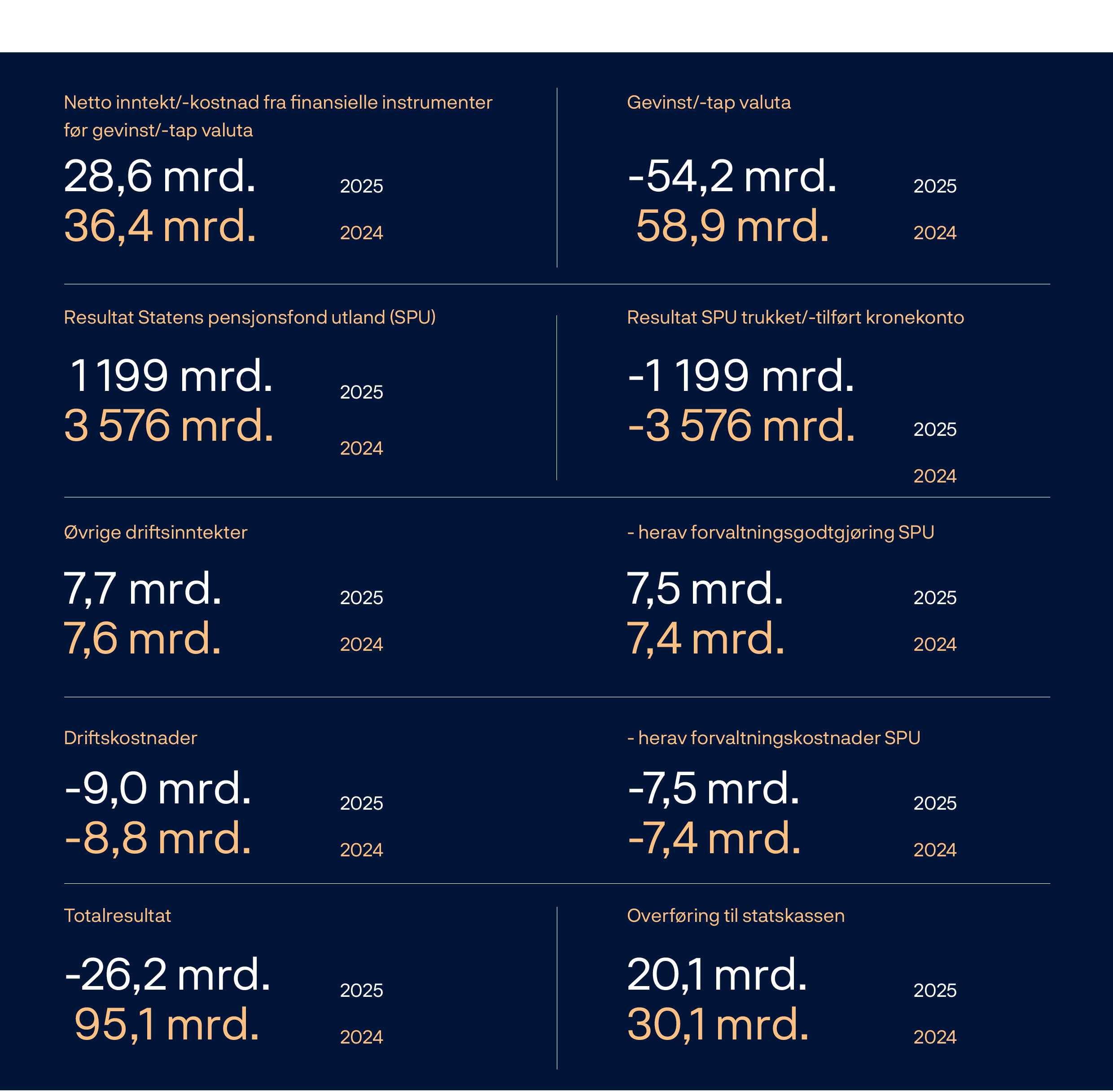 Det internasjonale aksjemarkedet steg gjennom året og bidro til positiv avkastning både for Statens pensjonsfond utland (SPU) og Norges Banks valutareserver. Verdien av SPU var ved utgangen av året på 21 268 milliarder kroner. Fondets verdi ble påvirket av avkastningen på investeringene, kapitaltilførsel fra staten, samt endringer i valutakurser. Markedsverdien av den samlede aksje- og renteporteføljen i valutareservene var 727,5 milliarder kroner ved utgangen av 2025.