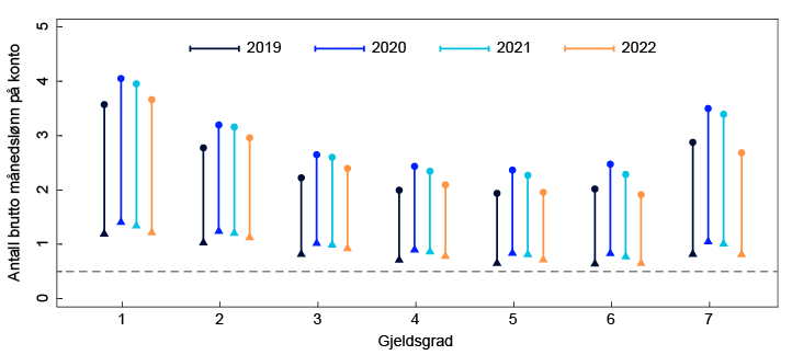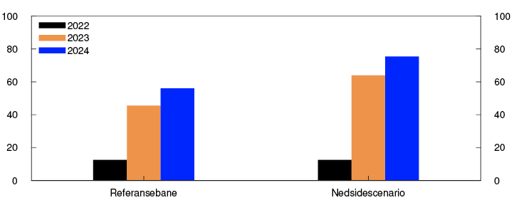 I referansebanen legger vi til grunn at gjennomsnittlig rente øker i takt med gjennomsnittlig endring i styringsrentebanen fra PPR 3/23. Inntekter faller med 14 prosent i 2023 og 5 prosent i 2024. Driftskostnadene faller med 90 prosent av det prosentvise inntektsfallet i 2023, og med like mye som det prosentvise inntektsfallet i 2024. I nedsidescenarioet legger vi til grunn samme renteøkning, men at inntekter (kostnader) faller mer (faller mindre) enn i referansebanen. Vi forutsetter at gjeldsveksten er null både i 2023 og 2024 i begge scenarioer.