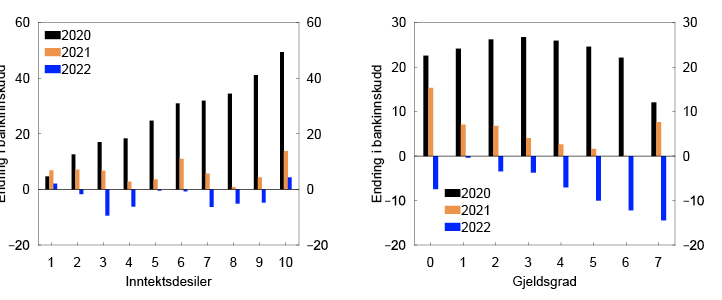 Ved økt rente, inntektsbortfall eller boligprisfall kan husholdningene i en periode bruke av likvide midler for å betjene gjelden eller for å dempe innstramminger i konsumet. Over de siste ti årene har husholdningenes finansformue økt mer enn inntektene, og økningen var særlig stor i 2020. Sparingen har bidratt til å gjøre husholdningene mindre sårbare. I fjor førte høy inflasjon og økte renter til at mange husholdninger brukte av oppsparte midler. Analysene i kapittel 2 viser at det var de med høyest gjeldsgrad som reduserte bankinnskuddene mest. Husholdningene med lavere gjeldsgrad hadde høyere innskudd ved utgangen av 2022 enn før pandemien.