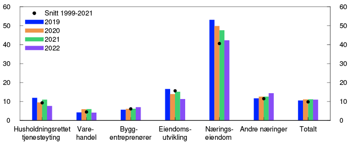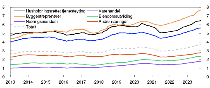 Blant konsumutsatte næringer og byggentreprenører er det normalt sett vanligere med både flere inkassosaker og flere konkurser enn i andre næringer. Det henger sammen med at disse næringene typisk har små marginer og lite kapital å ta av, og derfor er mindre motstandsdyktige mot midlertidige fall i etterspørselen. Det økte kostnadsnivået legger ytterligere press på foretakene i disse næringene. Dersom konsumet og byggeaktiviteten faller mer enn vi venter (se anslag i Pengepolitisk rapport 3/2023), kan betalingsproblemene raskt bli større, og konkursene kan tilta videre. Faren for at bankene påføres store tap begrenses likevel av at lånene til disse næringene utgjør en relativt liten del av samlede utlån (figur 3.2). Konsumutsatte næringer og byggentreprenører står imidlertid for nesten halvparten av sysselsatte i privat sektor. Problemer i disse næringene kan derfor ha betydelige ringvirkninger for økonomien og utgjøre en risiko for næringseiendomsforetakenes leieinntekter.