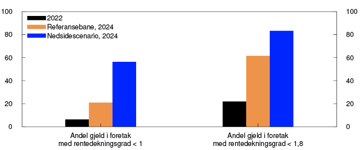 I vår referansebane halveres rentedekningsgraden fra 2 i fjor til litt under 1 i år og videre til 0,7 neste år for næringen samlet (figur 3.15). Det vil si at hele inntjeningen i år går med til å betjene de økte rentekostnadene, mens rentekostnadene neste år overstiger den samlede inntjeningen. I referansebanen legger vi til grunn at inntektene faller like mye som boliginvesteringene. Videre forutsetter vi at rentekostnadene dobles fra 2022 til 2024.