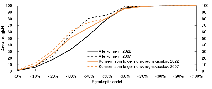 Siden 2007 har bokført egenkapital i næringseiendomskonsern økt, se sorte linjer i figur 3.B. Noe av denne økningen skyldes at flere næringseiendomsforetak har skrevet opp eiendomsverdiene til markedsverdi når de har gått fra norsk regnskapslov til IFRS som regnskapsstandard. Samtidig er en del av økningen i bokført egenkapital drevet av en bedring i faktisk soliditet. Det er illustrert ved at soliditeten i næringseiendomskonsern som benytter norsk regnskapslov, er bedre i 2022 enn i 2007, se oransje linjer i figur 3.B.