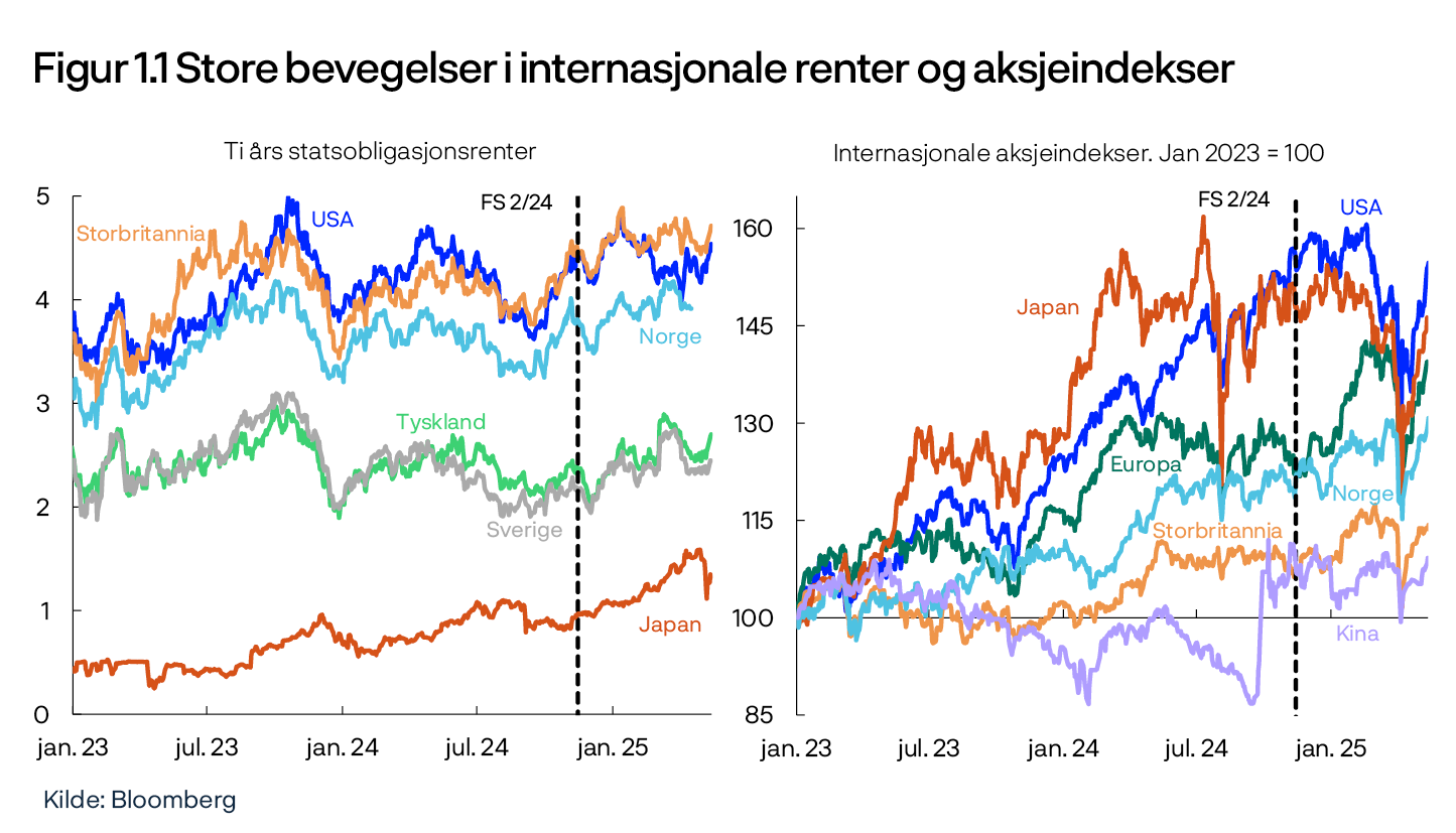 Det oppstod økt usikkerhet om den økonomiske politikken i USA etter at ny administrasjon ble innsatt i januar. Markedsaktørene justerte ned vekstforventningene til den amerikanske økonomien, og amerikanske renter og aksjeindekser falt, se figur 1.1. Flere europeiske land annonserte store investeringer i forsvar og infrastruktur. Det bidro til høyere vekstforventninger i Europa og oppgang i europeiske renter og aksjeindekser.