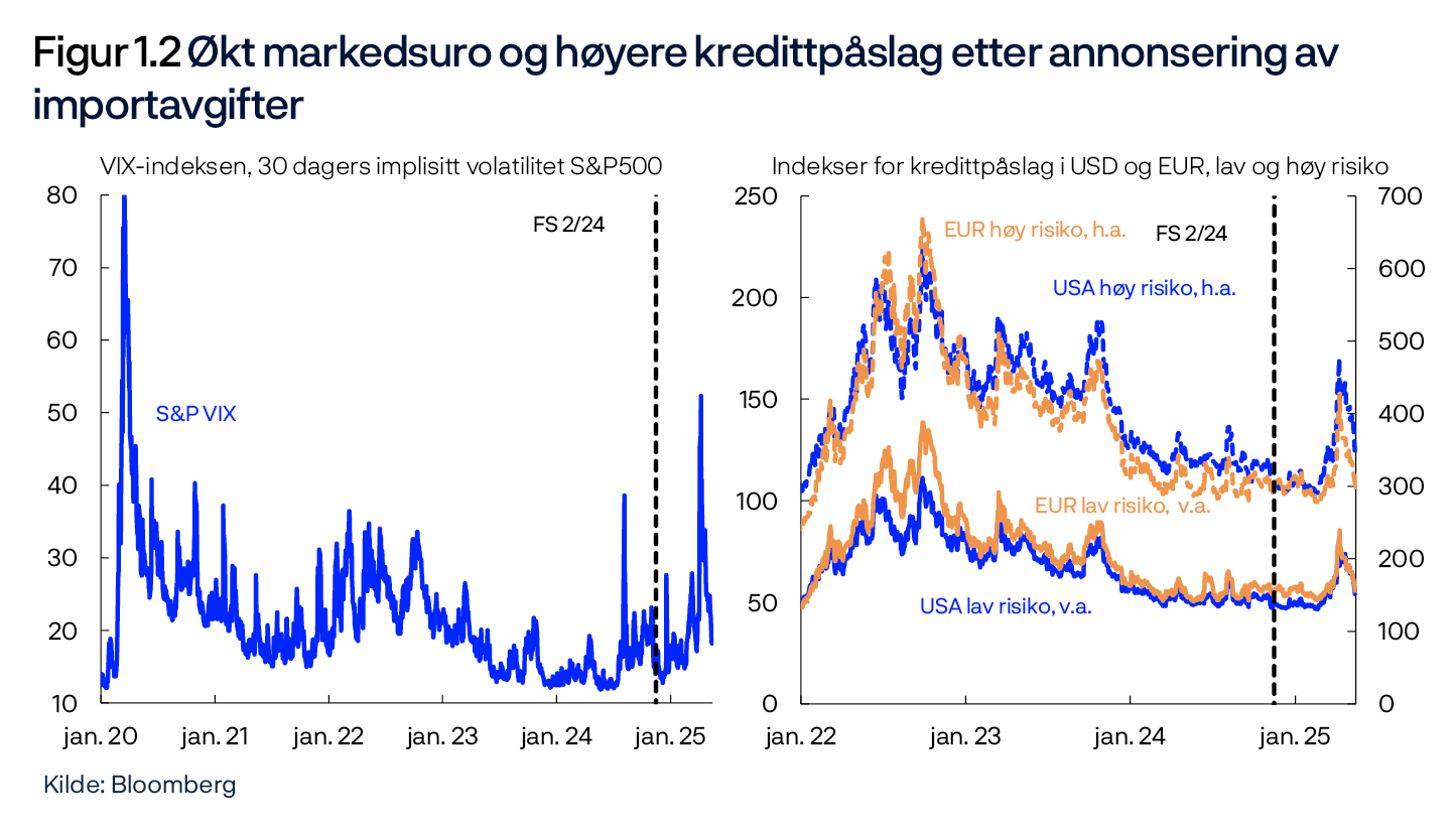 Etter at USA varslet innføring av betydelig økte tollsatser, økte indikatorer for usikkerhet mye og det har vært store prisbevegelser i finansmarkedene. Oljeprisen falt, den norske kronen svekket seg, og risikopremier økte. Markedsbevegelsene har i stor grad blitt reversert, men usikkerhet om rammebetingelsene for internasjonal handel og vedvarende geopolitiske spenninger ser ut til å ha svekket de makroøkonomiske utsiktene ute.