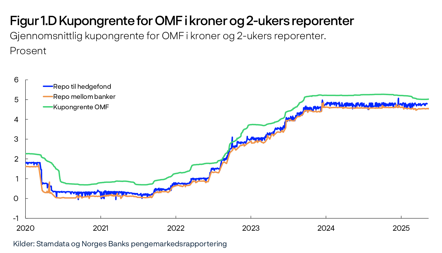 Mange hedgefond lånefinansierer sine investeringer for å oppnå høy avkastning for sine eiere. De kan for eksempel finansiere kjøp av OMF med repo. I repo-finansieringen gir de OMF-en tilbake til motparten som sikkerhet. Da får de lånefinansiert mesteparten av kjøpet. Fondene tjener penger så lenge avkastningen på OMF fra renter og kurssvingninger er høyere enn renten de betaler i repo. De siste årene har den gjennomsnittlige kupongrenten på OMF i kroner med flytende rente vært rundt 40 basispunkter høyere enn renten i gjenkjøpsavtalene, se figur 1D. Samtidig har kurssvingningene for OMF med flytende rente vært svært små. Stabil løpende avkastning kombinert med mye lånefinansiering, har gjort denne strategien lønnsom for fondene.