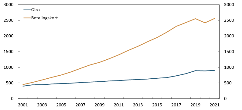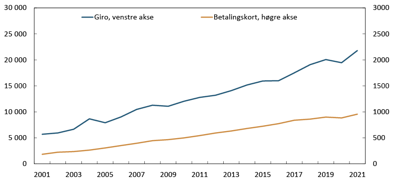 Verdien av girobetalingane var 21 787 milliardar kroner i 2021, sjå figur 2. Verdien av kortbetalingane var 956 milliardar kroner.