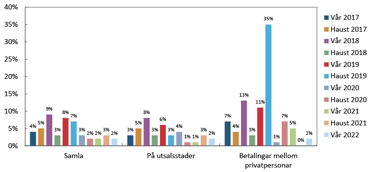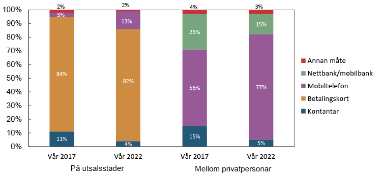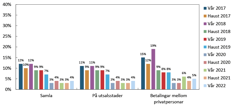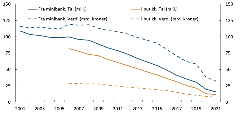 Spørjeundersøkingane våre syner at 4 prosent av dei spurde nytta kontantar ved si siste betaling på fysisk utsalsstad. Tallet har lege stabilt sidan pandemiutbrotet våren 2020. Talet på uttak av kontantar frå minibankar og i butikkar har halde fram med å falle, men noko mindre i 2021 enn i 2020. Verdien av uttaka frå minibankar har òg halde fram med å falle, medan verdien av uttaka i butikkar auka noko.