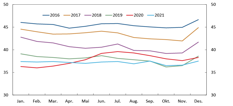 I samband med pandemiutbrotet i 2020 vart det ei stund vanlegare å gjere meir sjeldsynte innkjøp, men i 2021 steig talet på korttransaksjonar per innbyggjar att, sjå figur 4. I gjennomsnitt brukte kvar innbyggjar betalingskort (til betalingar og kontantuttak) 479 gonger i 2021, mot 456 gonger i 2020. Den gjennomsnittlege verdien på korttransaksjonane auka frå 383 kroner i 2020 til 389 kroner i 2021.