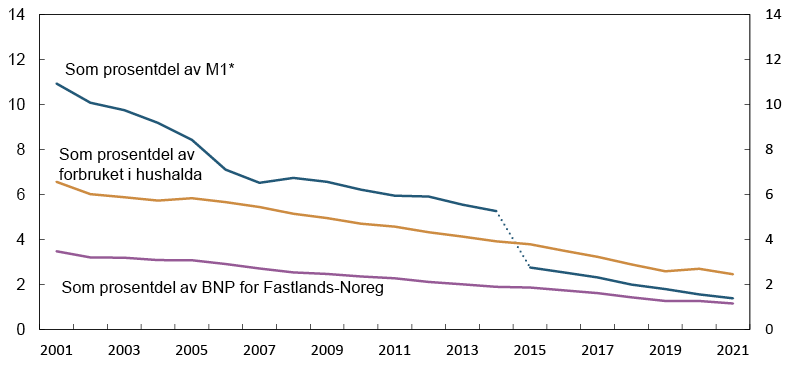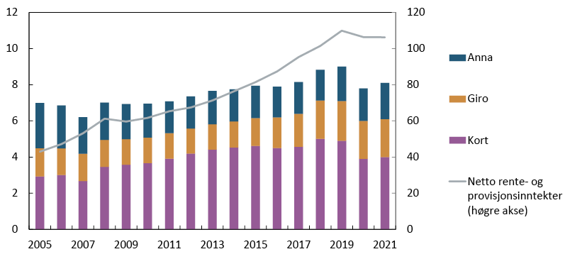 3 For meir informasjon, sjå historisk betalingsstatistikk på nettsida til Noregs Bank: https://www.norges-bank.no/tema/Statistikk/betalingsstatistikk/
