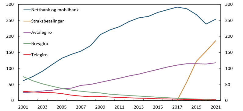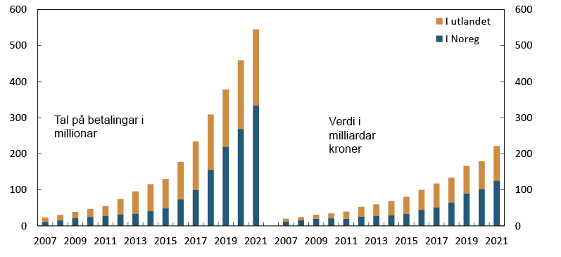 Talet på straksbetalingar auka frå 154 millionar i 2020 til 187 millionar i 2021. Verdien av straksbetalingane i 2021 var 134 milliardar kroner.