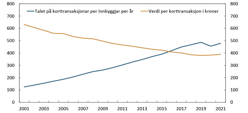 Figur 4 Talet på korttransaksjonar per innbyggjar per år og verdi per korttransaksjon i kroner. 2001–2021