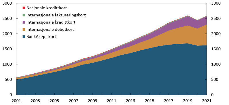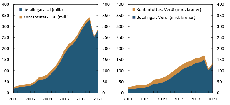 I 2021 vart det gjort 2562 millionar betalingar med norske betalingskort. I tillegg kjem reine kontantuttak.6 Til saman vart det gjort 2582 millionar korttransaksjonar, sjå tabell 10a i vedlegget.