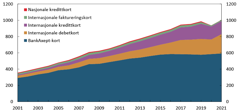 Ved utgangen av 2021 var det totalt utferda 12,9 millionar norske betalingskort, sjå oversikt 1.