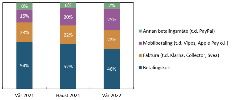 I kjøpsaugneblinken er det slett ikkje all netthandel som vert gjord opp på tradisjonell måte med eit betalingskort. I samband med den halvårlege undersøkinga til Noregs Bank om bruk av kontantar spurde vi også deltakarane om korleis dei betalte for den siste netthandelen sin. Figur 8 syner at noko under halvparten av kjøpa vart betalte direkte med betalingskort. Om lag éin firedel av kjøpa vart betalte med ei mobilbetalingsløysing. Noko under éin firedel vart betalte med faktura. Men jamvel der den primære betalingsmåten er faktura, mobilbetaling eller ein annan måte, ligg det også her ofte ei kortbetaling til grunn. Betalingskort er som regel betalingskjelda ved betalingar på nettstad med mobilen. Og betalingskort vert ofte nytta til å gjere opp fakturaen frå netthandelen. I undersøkingane er det stadig fleire som seier at dei nytta mobilbetaling ved sin seinaste handel på nett.