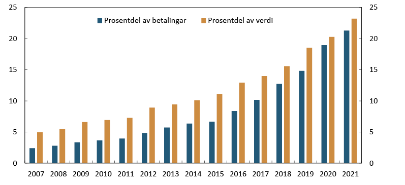 Betalingar over internett utgjer ein stadig større del av dei totale betalingane gjorde med norske betalingskort. Figur 9 syner at betalingane over internett i 2021 utgjorde 21 prosent av alle betalingar med norske kort. Målt i verdi utgjorde internettbetalingane 23 prosent av alle kortbetalingane i 2021.