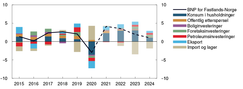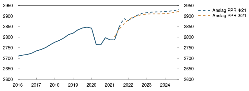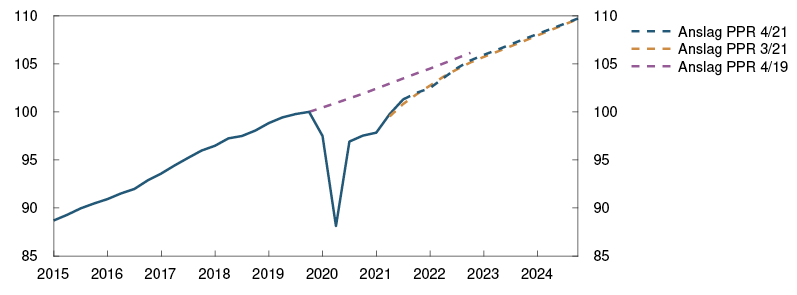 Lettelser i smitteverntiltakene gjennom året har gitt en markert oppgang i norsk økonomi, og aktiviteten er høyere enn før pandemien. BNP for Fastlands-Norge har steget videre utover høsten og har vært om lag som anslått i forrige rapport. Oppgangen var sterkest i tjenesteytende næringer, som tidligere var hardt rammet av smitteverntiltak.