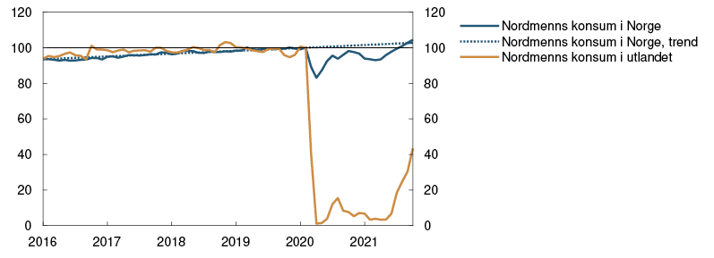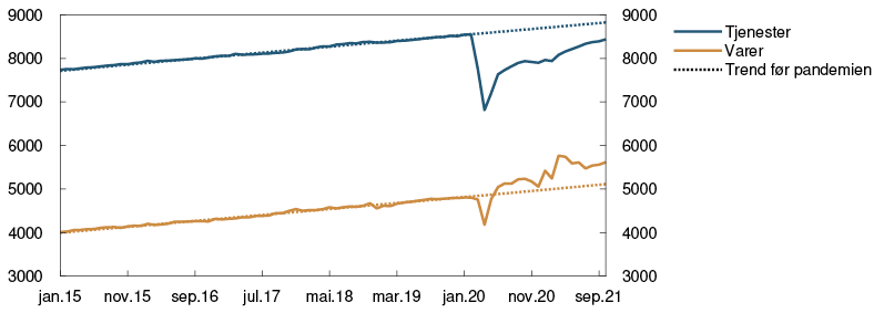 I USA var BNP-veksten i tredje kvartal lavere enn anslått i forrige rapport, men aktivitetsnivået er allerede om lag 1,5 prosent høyere enn før pandemien. Frykt for å bli smittet og smitteverntiltak har bidratt til at husholdningenes konsum av tjenester er betydelig lavere enn trenden før pandemien skulle tilsi, se figur 1.2. Sammen med økonomiske støttetiltak til husholdningene under pandemien har det bidratt til sterk vekst i etterspørselen etter varer. Blant annet har høy etterspørsel etter elektronikk bidratt til en global mangel på databrikker, noe som hemmer bilproduksjonen i flere land. I tillegg er det forstyrrelser i distribusjonen av varer. I flere havner i USA og i transportleddene videre er det stor mangel på arbeidskraft, og skip må ligge i kø i mange dager før varene blir losset. Effekter av disse pandemirelaterte forholdene forplanter seg til andre land. Leveringstidene har økt betydelig for varer i mange land, og prisveksten har vært høy. Vi legger til grunn at dette, sammen med høye energipriser, demper veksten i USA og Europa de nærmeste kvartalene.