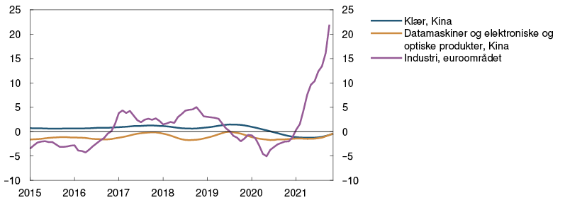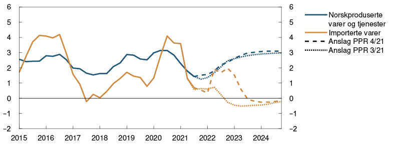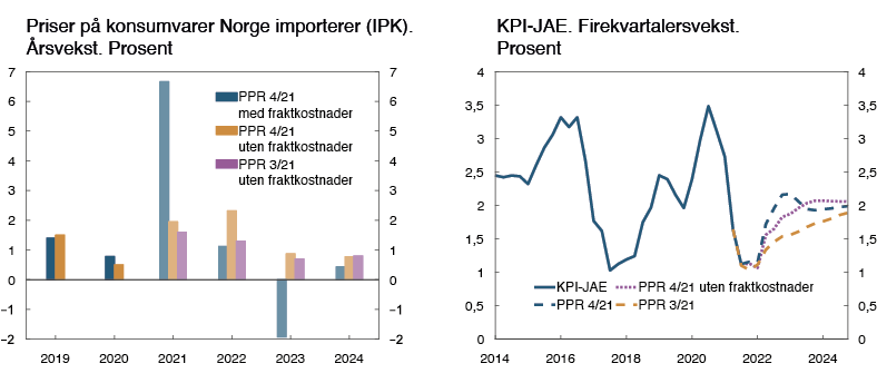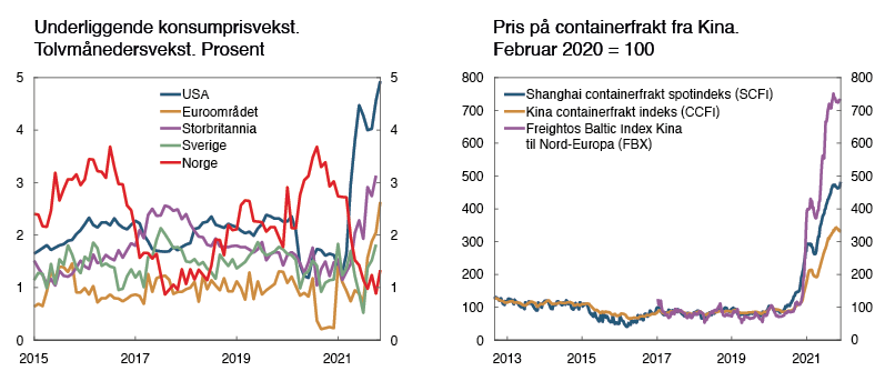 Rask oppgang i etterspørselen og forsinkelser i produksjon og distribusjon av varer har gitt lange leveringstider, en kraftig oppgang i fraktrater og store prisøkninger på en del varer og tjenester. Sammen med høye energipriser har dette dempet den økonomiske veksten hos handelspartnerne og bidratt til en kraftig oppgang i den samlede konsumprisveksten i mange land. Inflasjonsforventningene har økt, og det er utsikter til at den underliggende prisveksten hos handelspartnerne blir høyere enn anslått i forrige rapport.