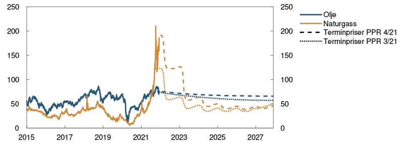 Fremtidsprisene for olje indikerer et videre moderat fall i prisen, se figur 1.A. Etter den markerte oppgangen siden andre halvår 2020, kan veksten i globalt oljeforbruk avta fremover, spesielt hvis smittespredningen øker. Samtidig kan oljeproduksjonen i land utenfor OPEC-pluss ta seg opp den nærmeste tiden. Fremtidsprisene noe ut i tid er imidlertid høyere enn lagt til grunn i septemberrapporten. Det kan reflektere at reduserte investeringer i ny produksjonskapasitet etter hvert kan gjøre at veksten i tilbudet av olje blir lavere enn veksten i etterspørselen.