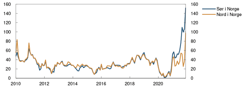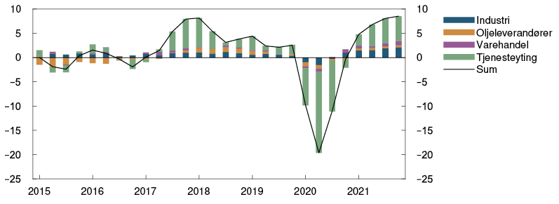 Bedriftene i Norges Banks regionale nettverk rapporterte i november om en sterk oppgang i kapasitetsutnyttingen og at mangel på arbeidskraft og forsinkelser i globale verdikjeder begrenser produksjonen. Sammen med økt smittespredning og tiltak for å begrense smitten vil det dempe den økonomiske aktiviteten den nærmeste tiden. Deretter er det utsikter til at oppgangen fortsetter. Husholdningenes kjøp av varer og tjenester har tatt seg godt opp det siste halve året og har vært høyere enn ventet. Begrensede forbruksmuligheter har gjort at husholdningene har spart mye under pandemien. Det gir trolig rom for fortsatt god vekst i privat konsum når smitten avtar og smitteverntiltakene lettes på. Tjenestenæringene ventes å stå for mye av den økonomiske oppgangen utover våren neste år.
