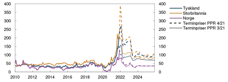 Fremtidsprisene for nordisk kraft indikerer at prisen i Norge kan holde seg høy gjennom vinteren og høyere enn lagt til grunn i septemberrapporten.7 Med oppgang i kraftforbruket utover vinteren kan Norge måtte importere kraft fra kontinentet til høye priser for å opprettholde krafteksporten fra Norge til Storbritannia, der kraftprisen er enda høyere. Fremtidsprisene indikerer imidlertid at kraftprisen i Norge vil falle markert frem mot sommeren 2022, i tråd med det vanlige sesongmønsteret og forventninger om mer normal fyllingsgrad i vannmagasinene. Fremtidsprisene for europeisk kraft faller også markert. Det gjenspeiler først og fremst fallet i fremtidsprisene for gass, se over.