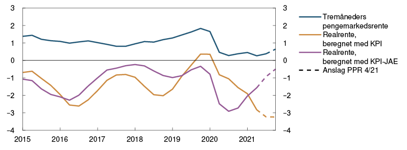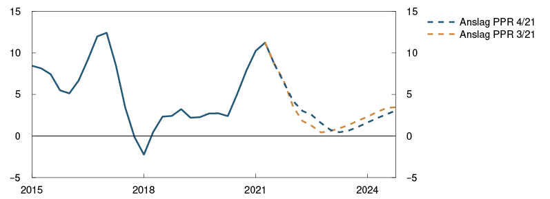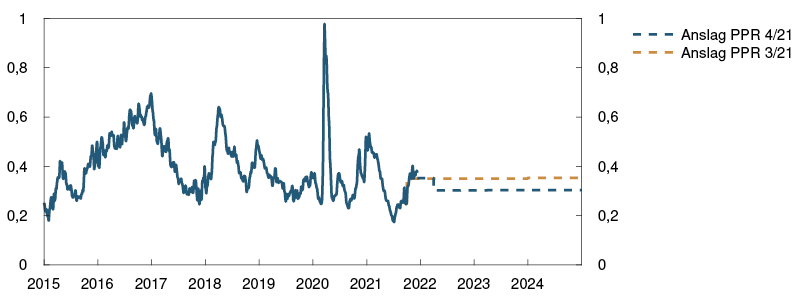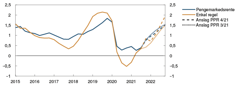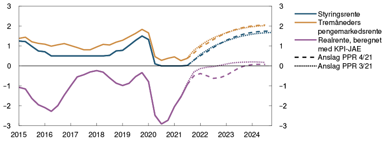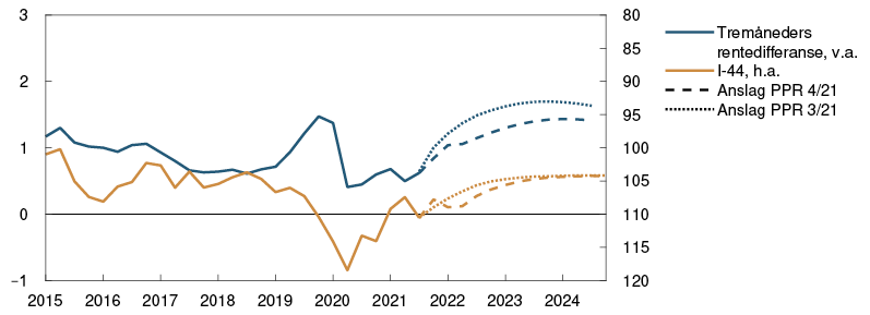 2 Periode: 1. januar 2015 – 31. desember 2024. Dagstall til og med 14. desember 2021. Kvartalstall fra 4. kv. 2021 for PPR 3/21 og 1. kv. 2022 for PPR 4/21. Terminrenter per 17. september 2021 for PPR 3/21 og 14. desember 2021 for PPR 4/21. For euroområdet vises ESBs innskuddsrente.