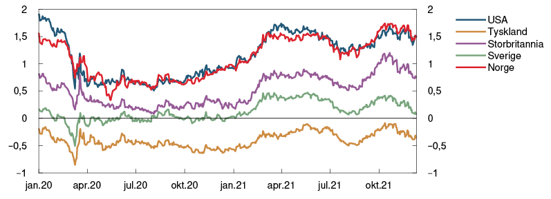 Utsikter til høyere prisvekst har bidratt til å løfte styringsrenteforventningene hos våre viktigste handelspartnere. Markedsprisingen indikerer nå forventninger om at styringsrentene hos flere av handelspartnerne vil bli satt opp i løpet av neste år. Langsiktige statsobligasjonsrenter er lite endret.