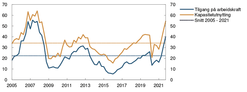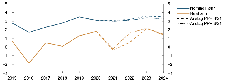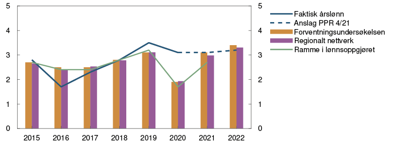 Løpende lønnsstatistikk tyder på at lønnsveksten har vært om lag som ventet, men den høye etterspørselen etter arbeidskraft har trolig løftet lønnsveksten litt mot slutten av året. Lønnsveksten i inneværende år ventes derfor å bli noe høyere enn anslått i forrige rapport. Lønnsforventningene for 2022 har økt siden forrige rapport.