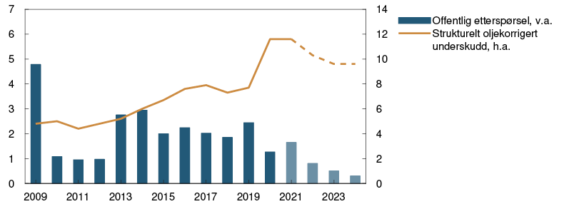 | Strukturelt, oljekorrigert underskudd som andel av trend-BNP | 11,6 | 11,6 | 10,3 | 9,6 | 9,6 | |