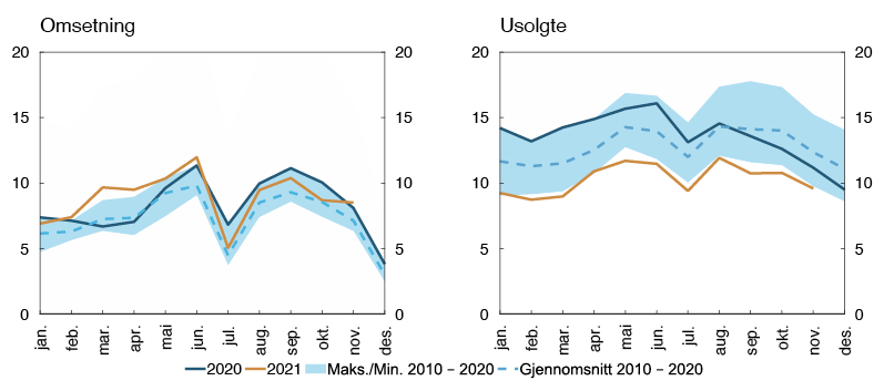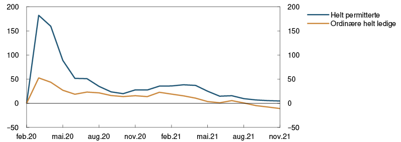 Bedringen i arbeidsmarkedet har fortsatt i takt med den økte økonomiske aktiviteten. Sysselsettingen har økt mer enn anslått i forrige rapport, og antall ledige stillinger er på et høyt nivå. Den sesongjusterte registrerte arbeidsledigheten har falt litt mer enn ventet og var i november 2,3 prosent. Antallet langtidsledige har falt. Den siste uken har gjeninnføringen av smitteverntiltak gitt nye permitteringsvarsler, og ledigheten vil trolig stige noe den nærmeste tiden.