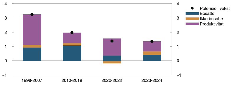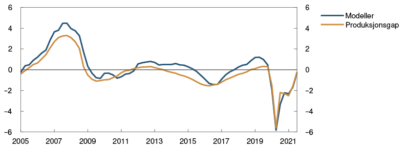 | Produksjonsgap for Fastlands-Norge (nivå) | -2,9 | -0,8 (0,2) | 0,7 (-0,6) | 1,3 (0,0) | 1,0 (0,1) | |