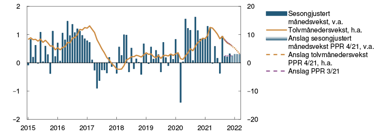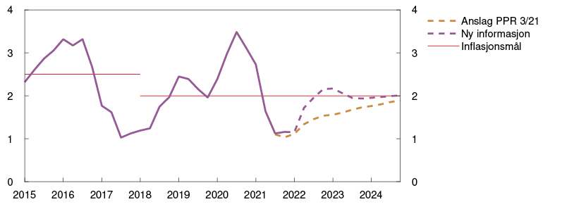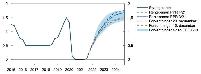 Oppgangen i norsk økonomi har fortsatt. Arbeidsledigheten har falt videre, og kapasitetsutnyttingen anslås å være over et normalt nivå. Økt smittespredning og omfattende smitteverntiltak ventes å dempe aktiviteten den nærmeste tiden. Når smitten etter hvert avtar og tiltakene lettes på, vil den økonomiske oppgangen trolig fortsette. Økte strømpriser har gitt høy konsumprisvekst, men den underliggende inflasjonen er lavere enn inflasjonsmålet. Stigende lønnsvekst og høyere prisvekst på varene vi importerer ventes å løfte den underliggende inflasjonen fremover.