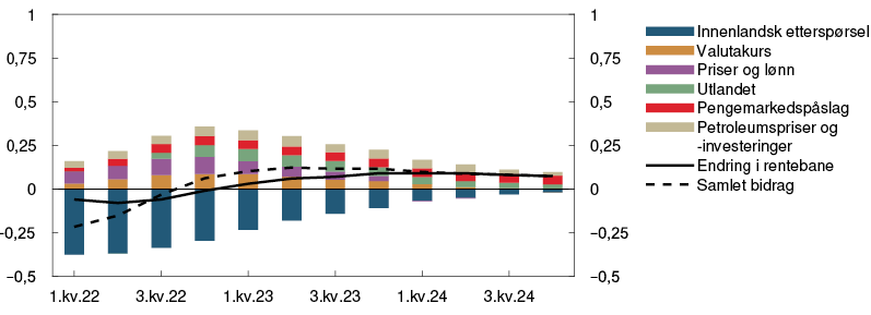 Prognosen for styringsrenten er lite endret og indikerer en styringsrente som øker til om lag 1,75 prosent i løpet av de nærmeste årene. Med en slik utvikling i renten er det utsikter til at den underliggende inflasjonen er nær målet i løpet av neste år. Kapasitetsutnyttingen anslås å falle på kort sikt, men være over et normalt nivå i årene som kommer.