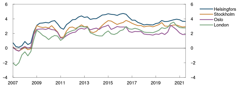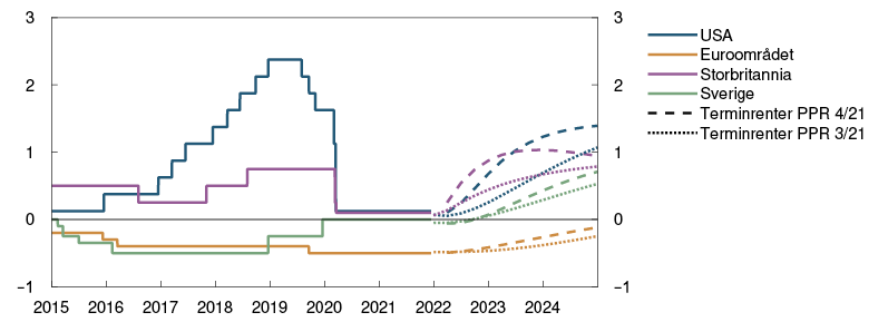 Utsikter til høyere prisvekst det neste året har bidratt til å trekke opp styringsrenteforventningene hos våre viktigste handelspartnere siden forrige rapport. Markedsprisingen indikerer forventninger om at styringsrentene settes opp i løpet av det neste året. Styringsrenteforventningene har steget spesielt mye i USA og Storbritannia. Den britiske sentralbanken har signalisert at styringsrenten snart settes opp, og i markedet ventes renteheving i første kvartal neste år. Den amerikanske sentralbanken har redusert takten i sine aktivakjøp noe og vil gradvis redusere kjøpene ytterligere i månedene som kommer. Det er forventet renteheving i USA i andre kvartal neste år.