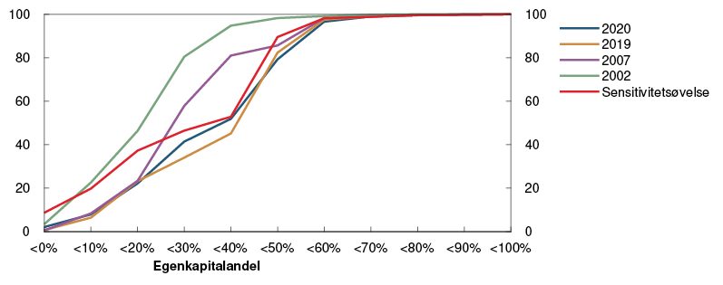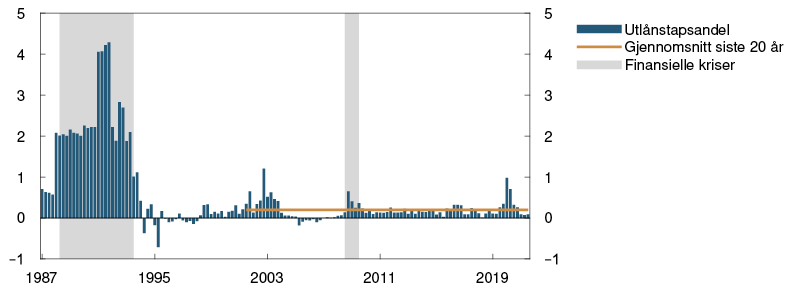 Vi venter at tapene fremover vil ligge nær gjennomsnittet for de siste 20 årene. Omfattende smitteverntiltak øker usikkerheten omkring tapsanslagene noe. En relativt liten andel av bankenes eksponeringer er mot de næringene som har blitt mest direkte rammet av smitteverntiltak. Det begrenser bankenes tapsrisiko. Blir det behov for mer langvarige smitteverntiltak som bremser den økonomiske aktiviteten, kan bankenes tap øke.