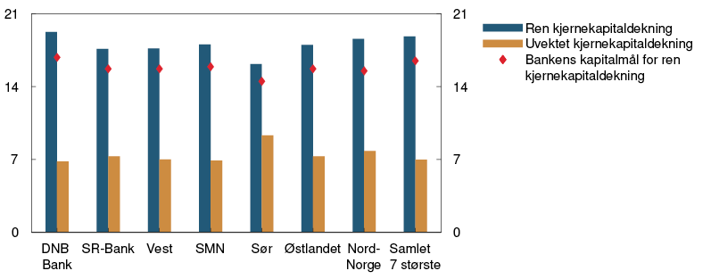 19 Per 3. kv. 2021. Samlet 7 største er et vektet gjennomsnitt av de syv bankene vist i figuren. Kapitalmål er her regulatoriske krav per 30. juni 2022 tillagt kapitalkravmargin på 1 prosentenhet.