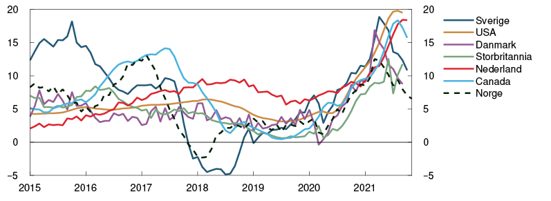 Høyere priser på energi, se «Rekordhøye gass- og kraftpriser, men lite endret oljepris», råvarer og elektroniske komponenter og kraftig økning i fraktrater har bidratt til markert oppgang i inflasjonen hos viktige handelspartnere. Tolvmånedersveksten i den samlede konsumprisindeksen økte til nær 7 prosent i USA og nær 5 prosent i euroområdet i høst, se figur 1.3. Veksten i energiprisene bidro til halvparten av tolvmånedersveksten i euroområdet. Den underliggende konsumprisveksten er på over 2,5 prosent i euroområdet, og i USA er den nær 5 prosent. De siste månedene har den underliggende prisveksten i USA, euroområdet og Storbritannia vært høyere enn anslått i forrige rapport.