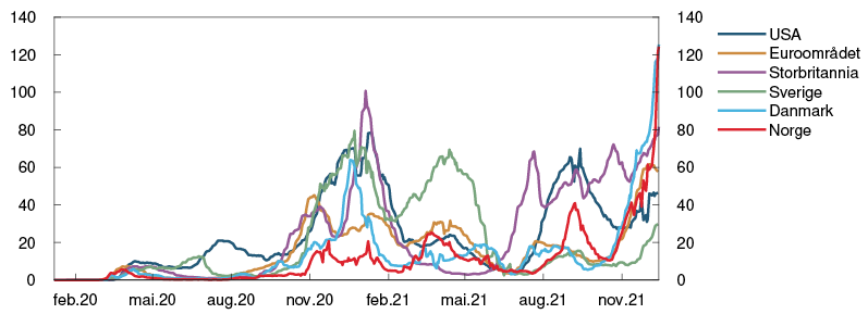 Den økonomiske aktiviteten hos Norges handelspartnere har fortsatt å stige. I tredje kvartal var BNP-veksten for handelspartnerne samlet litt høyere enn anslått i Pengepolitisk rapport 3/21, og den økonomiske aktiviteten er nå høyere enn før pandemien. Gjennom høsten har antall nye koronasmittede økt betydelig i Europa, og det er innført strengere smitteverntiltak. Samtidig skaper virusvarianten omikron stor usikkerhet om det videre forløpet for pandemien. Den økonomiske veksten hos handelspartnerne ventes derfor å avta den nærmeste tiden.