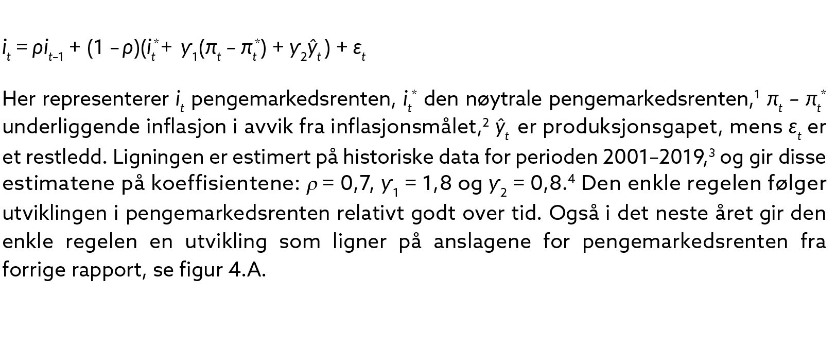 Oppgangen i norsk økonomi har fortsatt. Siden forrige pengepolitiske rapport har aktiviteten steget videre og arbeidsledigheten har falt. Økt smittespredning og omfattende smitteverntiltak ventes å dempe aktiviteten den nærmeste tiden. Når smitten etter hvert avtar og tiltakene lettes på, vil den økonomiske oppgangen trolig fortsette. Stigende lønnsvekst og høyere prisvekst på varene vi importerer ventes å løfte den underliggende inflasjonen fremover. Hensynet til å stabilisere inflasjonen rundt målet på noe sikt tilsier at styringsrenten økes mot et mer normalt nivå.