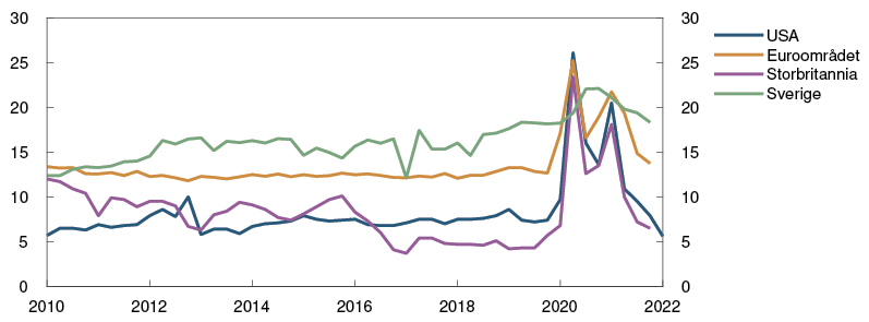 1 Periode: 1. kv. 2010 – 1. kv. 2022. Sparing som andel av husholdningenes disponible inntekt. Data til og med 1. kv. 2022 for USA og 4. kv. 2021 for euroområdet, Storbritannia og Sverige.