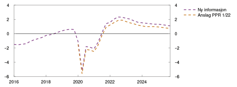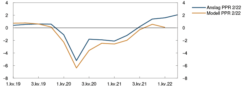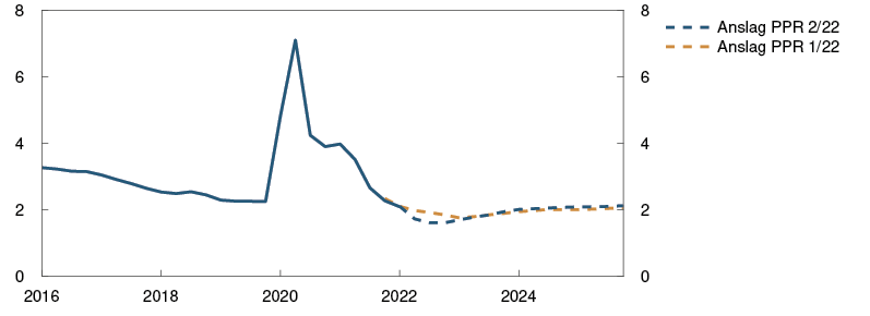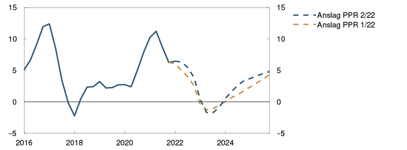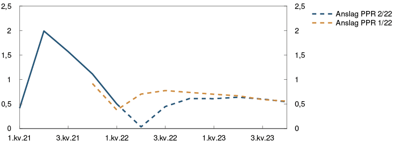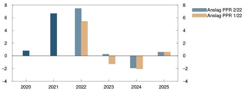 Prosentvis endring i anslag fra Pengepolitisk rapport 1/22 i parentes |