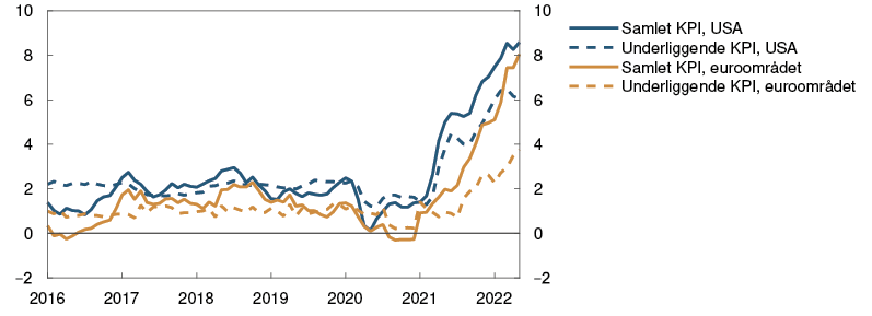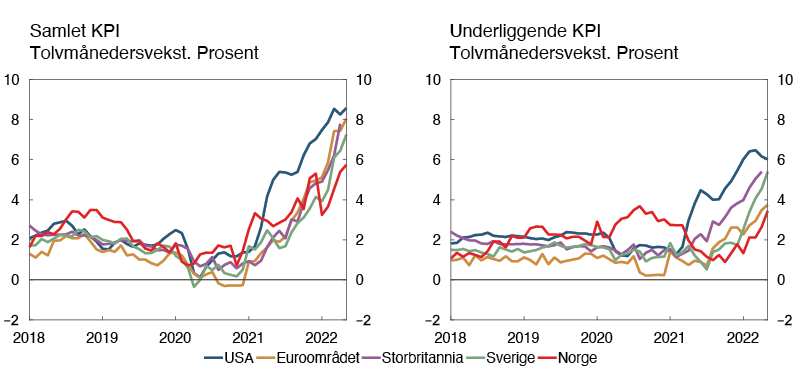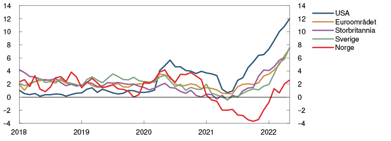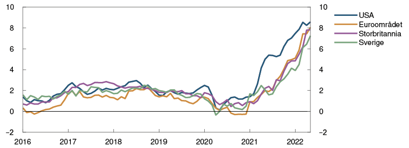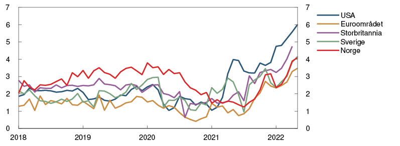 Det siste året har pandemirelaterte forhold både på tilbuds- og etterspørselssiden bidratt til markert oppgang i inflasjonen hos viktige handelspartnere. I vår har krigen i Ukraina bidratt til høye råvarepriser. Tolvmånedersveksten i den samlede konsumprisindeksen økte til over 8 prosent i USA og euroområdet i vår, se figur 1.3. Veksten i prisene på energi og mat bidro til over halvparten av tolvmånedersveksten i euroområdet, og den underliggende konsumprisveksten var 3,8 prosent i mai. I USA var den underliggende konsumprisveksten 6 prosent i mai. De siste månedene har den underliggende prisveksten hos alle våre viktigste handelspartnere vært høyere enn anslått i forrige rapport.