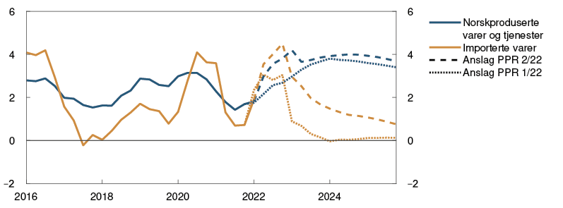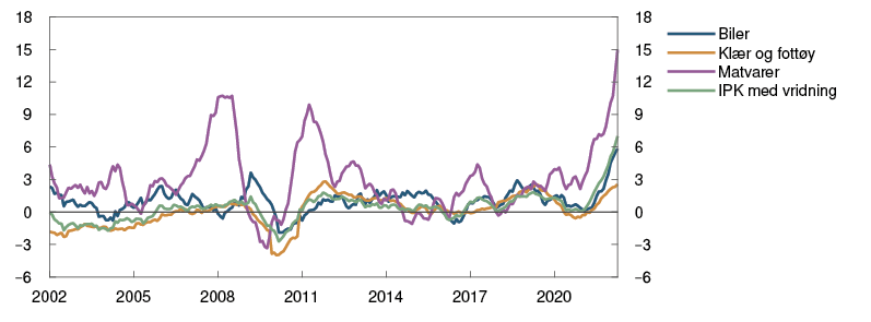 Veksten i produsentprisene på konsumvarer som Norge importerer (IPK), målt i utenlandsk valuta, har vært høyere enn ventet. De siste månedene har tolvmånedersveksten økt for alle delindekser, se figur 1.4. Prisveksten er særlig sterk på matvarer. Krigen i Ukraina vil trolig bidra til fortsatt høye matvarepriser i tiden fremover. Anslagene for i år og neste år er betydelig oppjustert fra forrige rapport, se tabell 1 i vedlegget.